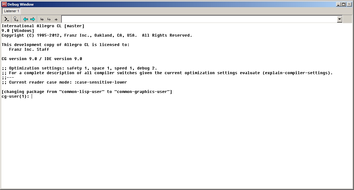 (or Start | Programs | Allegro CL 9.0 Free Express Edition | Allegro CL 9.0 Free Express Edition or Start | Programs | Allegro CL 9.0 Student Edition | Allegro CL 9.0 Student Edition). You should see a splash window and then a window titled `Allegro Common Lisp Console'. Shortly thereafter, the Allegro CL Integrated Development Environment windows appear, typically starting with some dialogs which you must resond to or dismiss (dismissing is okay). After everything is started, your screen will have various windows, including the Debug (i.e. Listener) window shown here:
