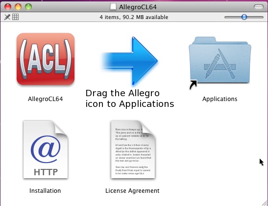 Allegro CL will then be installed (a progress bar will be displayed during installation). Once it is done, double click on Applications and you should see an entry for Allegro CL.