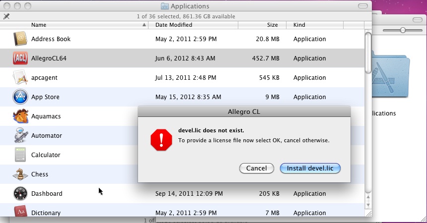 Click on the Install devel.lic button. You will see a Finder Window. Navigate to your devel.lic file and double click on it. It will be copied to the correct location in the Allegro CL application.