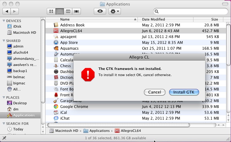 Because Allegro CL 9.0 SMP does not support the IDE, it is not necessary to have a working GTK Framework installed to use Allegro CL 9.0 SMP. If that is the only version you use, then no action is required to run on macOS 10.10. However, if you happen to need the GTK Framework for other uses and have been depending on the version supplied with Allegro CL, you can get the updated version which works with macOS 10.10 with the following steps: